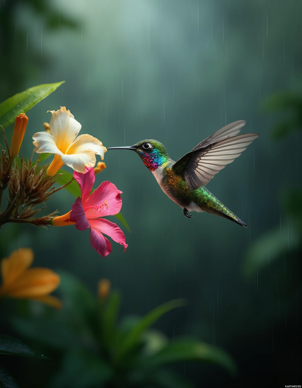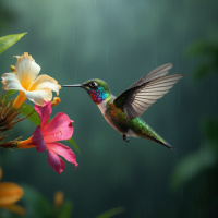 a hummingbird in flight, approaching a flower. The bird is green with