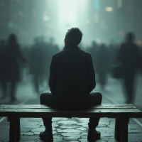 The image depicts a man sitting on a bench, facing away from the viewer. The man is wearing dark clothing and has