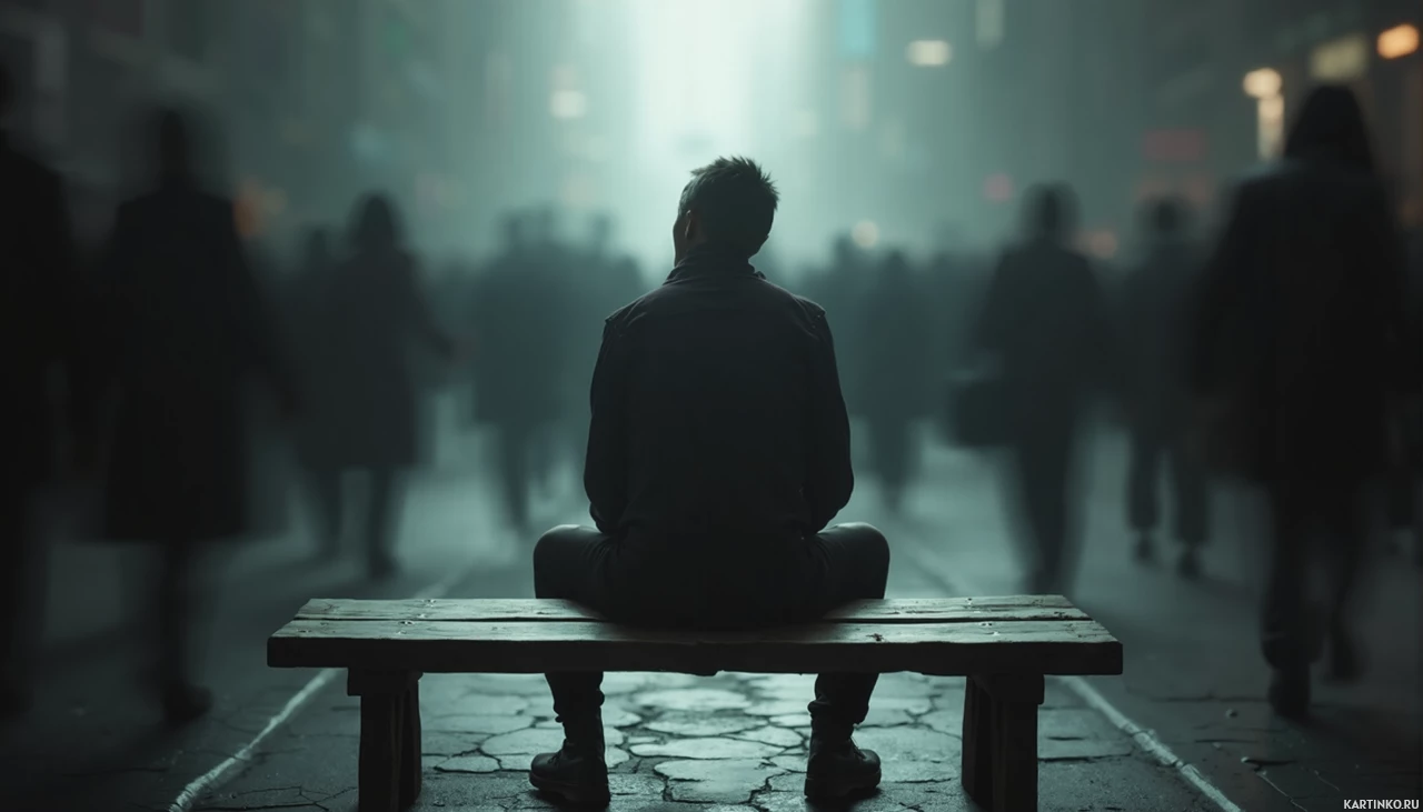several people walking around, but they are out of focus. The overall atmosphere of the image suggests that the man is lost in thought or deep in contemplation, perhaps enjoying some quiet time to himself amidst the hustle and bustle of