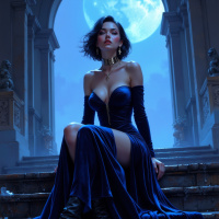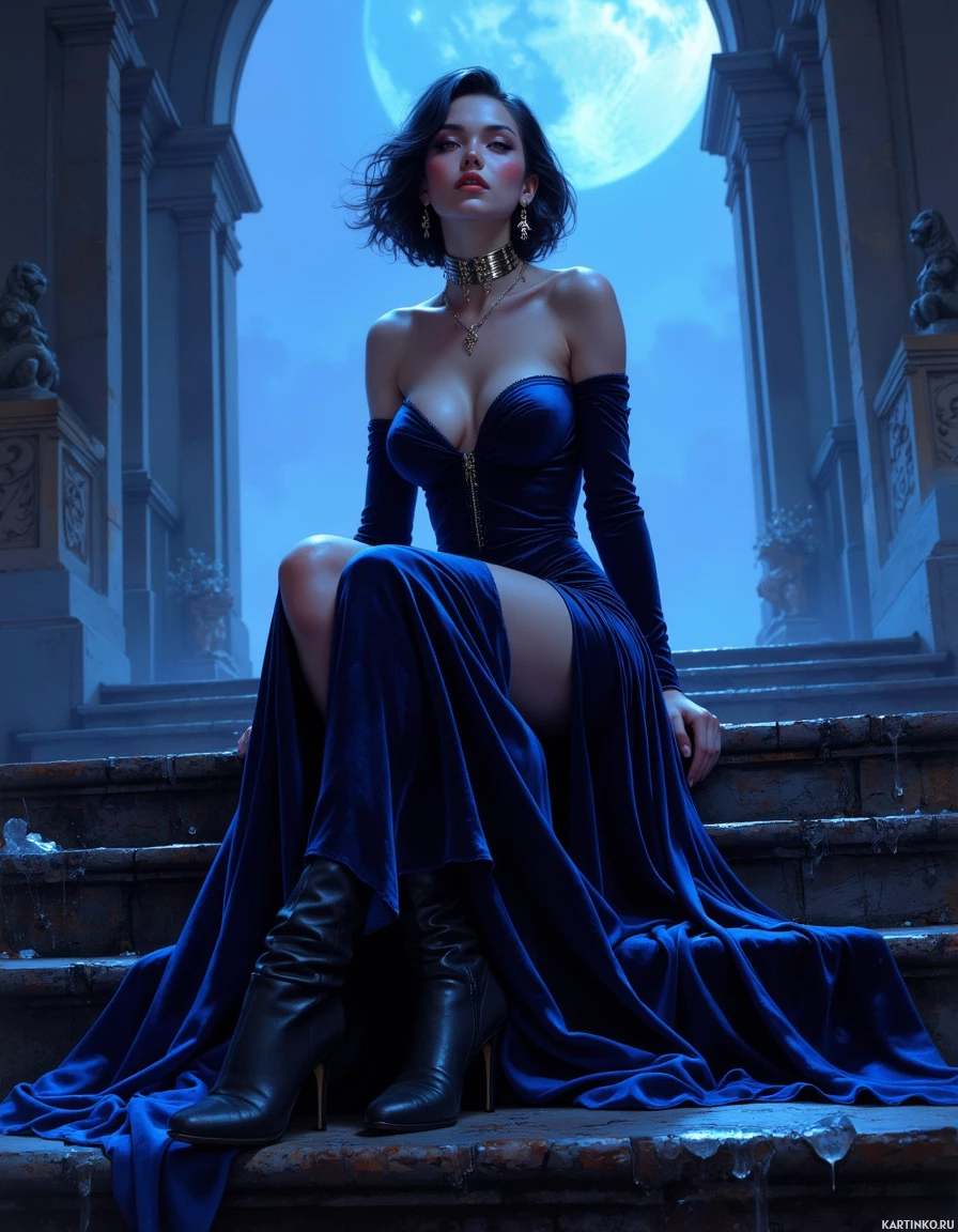 dark hair is styled in loose waves, framing her face as she gazes upwards towards the moon, which shines brightly behind her. Her makeup accentuates her features, and her expression is one of serenity. A gold choker adorns her neck, while dangling earrings add