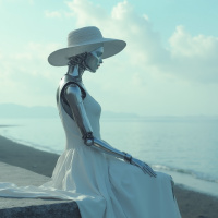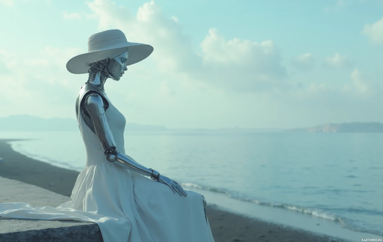 a white dress and hat, sitting on a concrete surface overlooking the ocean. The robot's