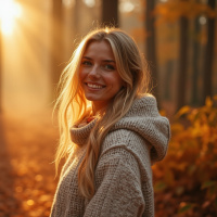 warm glow through the trees, illuminating the orange leaves scattered on the ground. The overall atmosphere exudes tranquility and relaxation, as if the woman has wandered into the woods to enjoy