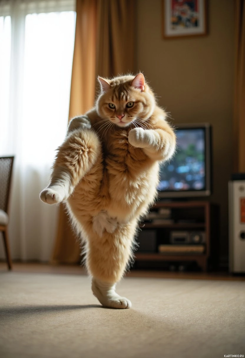 room setting. * TV visible in the background. The overall atmosphere of the image suggests that the cat is feeling confident or assertive, possibly due to its unusual stance. The blurred background adds