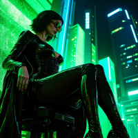 green lights illuminating the buildings and streets. Here are some key features of the scene: * The woman has short, dark hair and is wearing sunglasses. + Her attire consists of a shiny