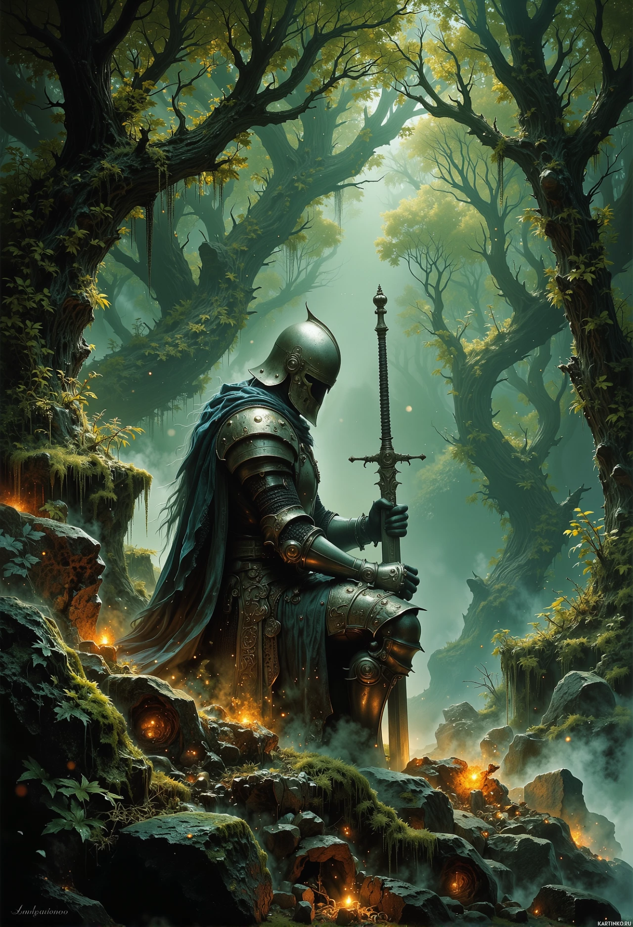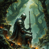 forest scene, with a warrior standing amidst the trees. The warrior is dressed in armor, holding a sword in their hand, and appears to be ready for battle. In the background of the image are several