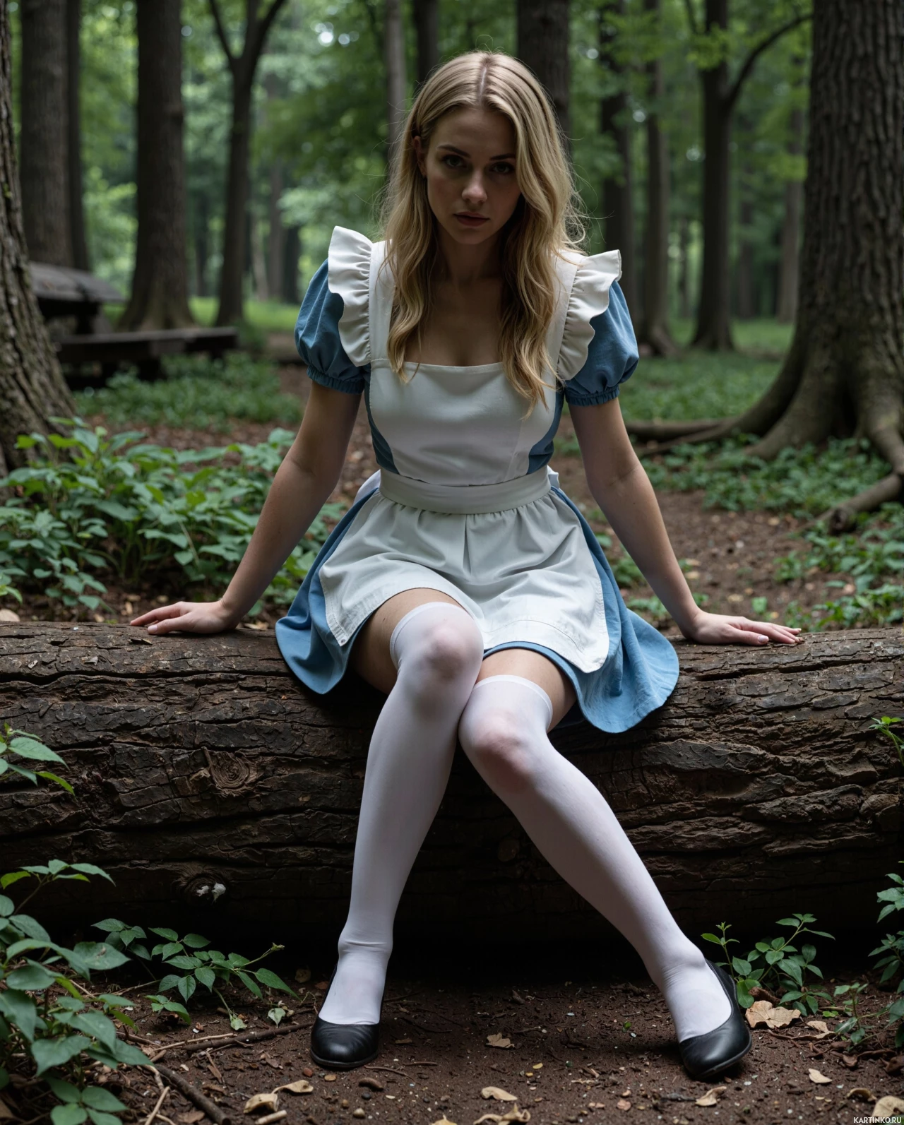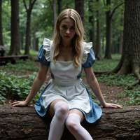 a touch of elegance to her overall appearance. Her legs are crossed, revealing white stockings that complement her black shoes perfectly. The forest setting provides a serene backdrop for the scene, with dappled sunlight filtering through the trees and casting intricate patterns on the ground. The atmosphere is tranquil, inviting the viewer to step into the world of Wonderland alongside Alice. In summary, the image captures a moment of quiet contemplation in a fantastical environment, where the boundaries between reality and fantasy blur. The woman's attire and expression evoke a sense of nostalgia for a bygone era, while the forest setting adds a touch of magic and wonder to the scene.