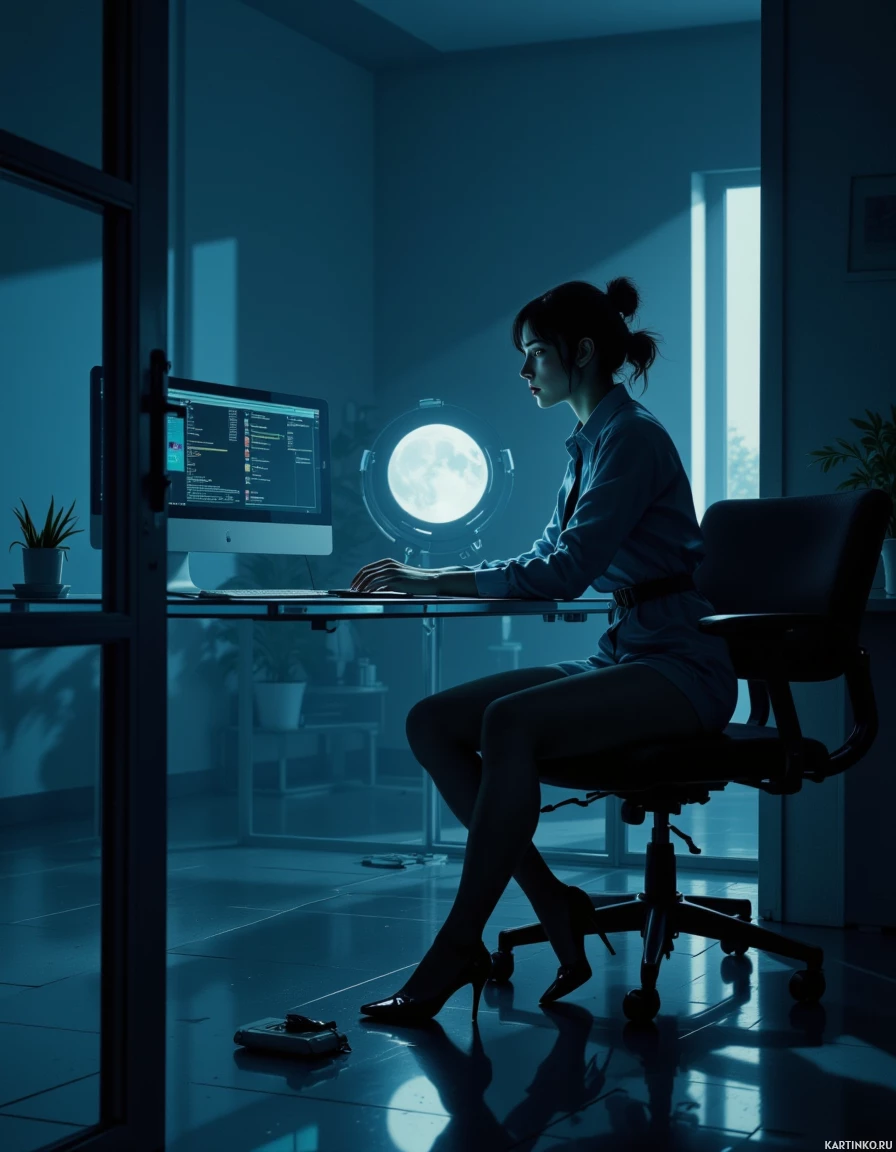 blue tones, suggesting it might be late in the day or night. There are various items on the desk around her, including what looks like a water bottle and some other