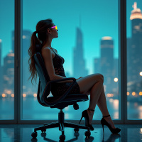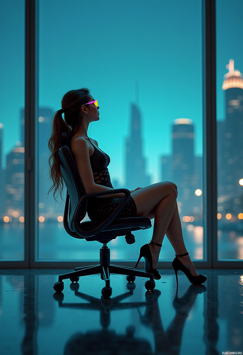 an office chair, gazing out of a window at a cityscape. She is dressed in a black dress with thin straps and has long