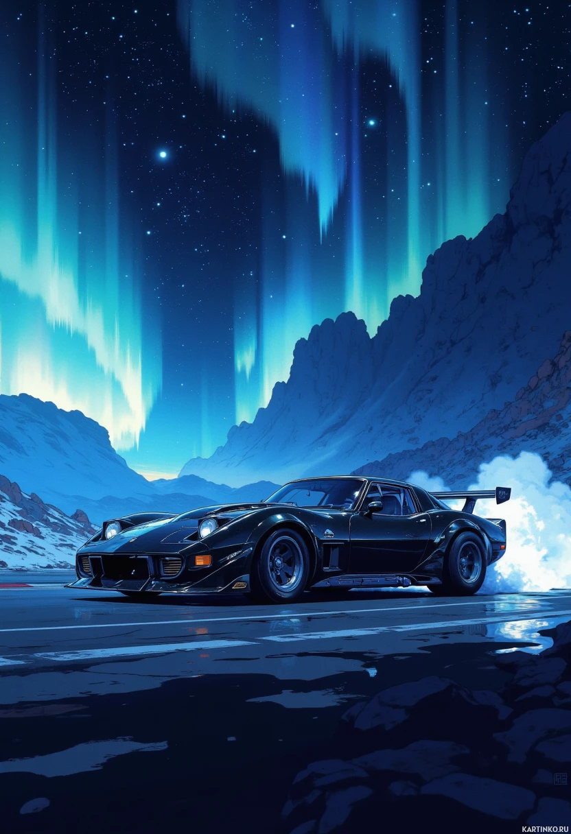 the rear of the vehicle, adding to its sporty appearance. In the background, snow-capped mountains rise up into the distance, their peaks shrouded in mist. The sky above is ablaze with color, as the aurora borealis dances across the horizon. The lights are a vibrant greenish-blue hue, with wispy tendrils stretching upwards towards the stars. The overall effect is one of breathtaking beauty and drama, capturing the essence of a winter wonderland. The image is rendered in a highly detailed and realistic style, with intricate textures and shading that bring the scene to life. The lighting is subtle yet effective, creating a sense of depth and atmosphere that draws the viewer in. Overall, this image is a stunning representation of a unique and captivating moment in time.